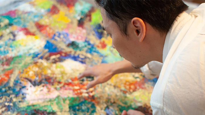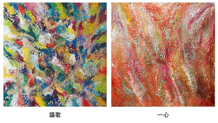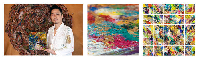”つながるピース”作品「謳歌」「一心」(25枚で1つの絵画)を含む新作絵画の展示。