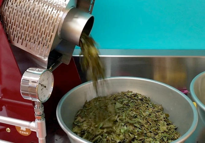 - 焙煎された椿の葉が85%前後に、発酵された九戸甘茶を15%前後に、程よくブレンドします。火が通りやすい大きさまで手揉みいたします。そして焙煎を行います。その後、手揉みを繰り返して、味わいを出す為の作業をして完成です。品格あるお茶に仕上げる為の作業は怠りません。