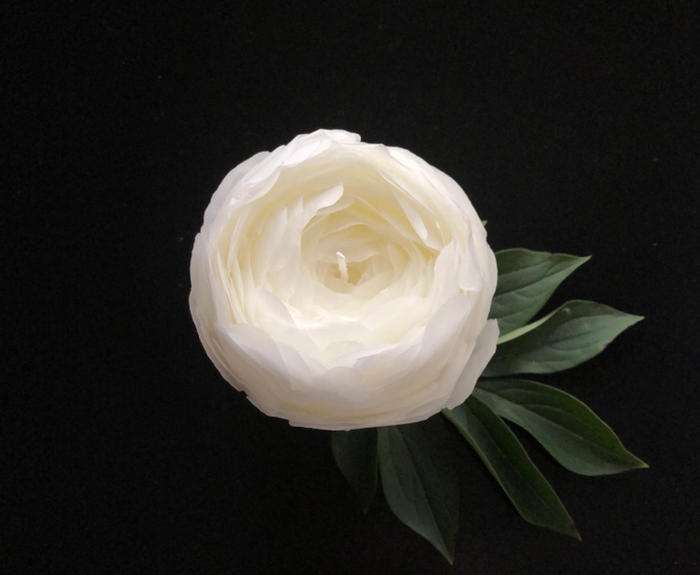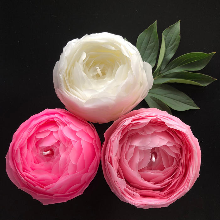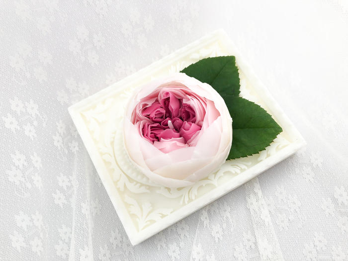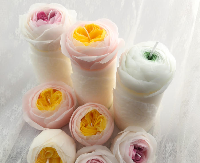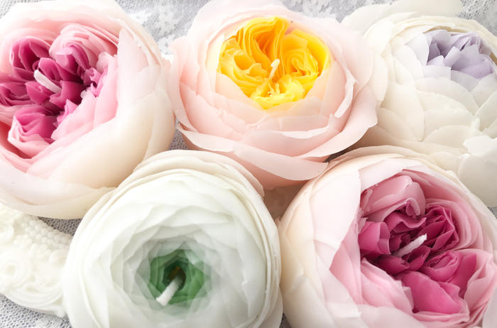- フラワーキャンドルには、漂白ミツロウを使用しています。温度管理をしながら、色付けをし、花びらや葉っぱを1枚1枚丁寧に仕上げています。花びらが枚数が200枚を超える作品もあります。