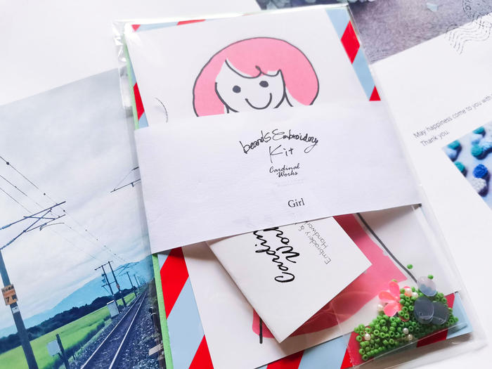 - 「ポストカード(1枚)、ビーズやスパンコール、針、刺繍糸、封筒、作り方動画など」が1つのセットになっているキットです。