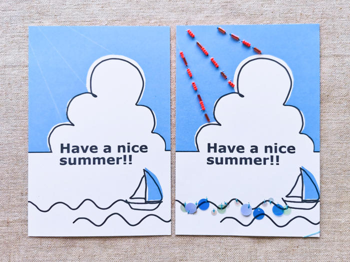 - 出来上がった作品はキットに入っている台紙にセットして飾ったり、メッセージを加えてプレゼントしたりして楽しまれて下さい。夏のお便りにもピッタリのカードです!