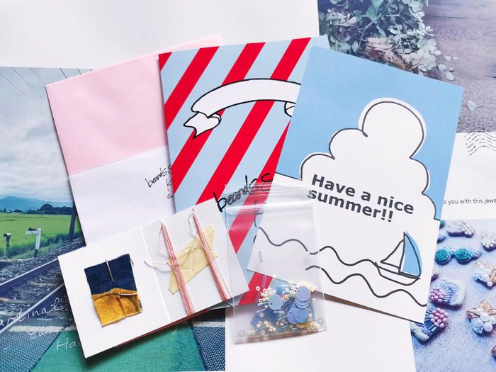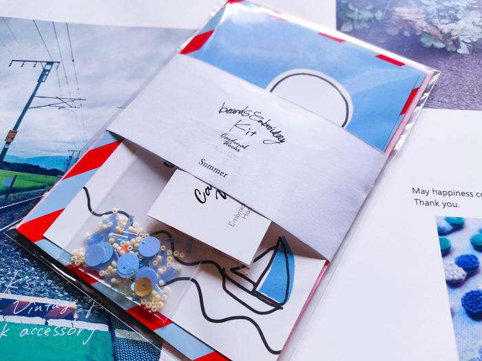 - 「ポストカード(1枚)、ビーズやスパンコール、針、刺繍糸、封筒、作り方動画など」が1つのセットになっているキットです。こちらは「夏の空と海」の絵柄のポストカード。夏の景色をビーズやスパンコールを使って刺繍していきます。小さなビーズでも通せる針と刺繍糸も付いているのですぐに制作できます。