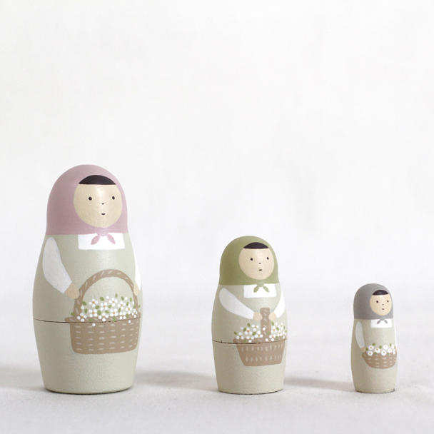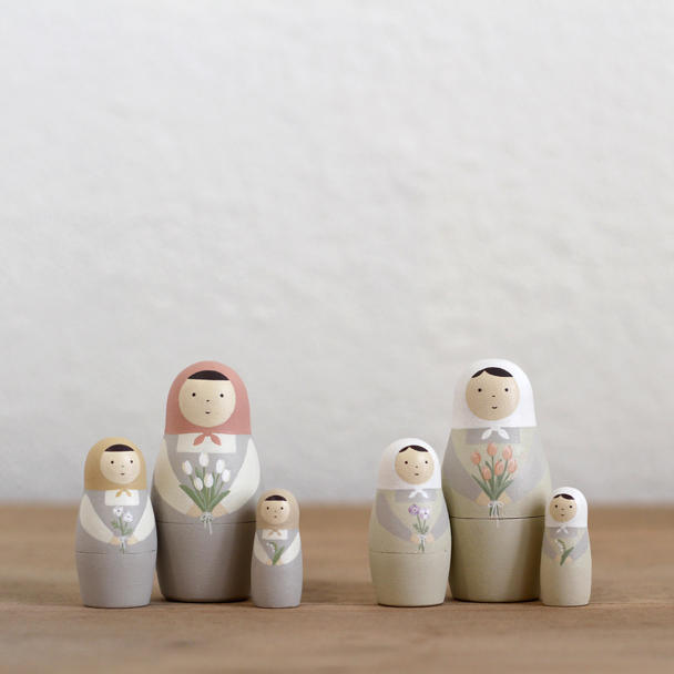 カラフルなイメージのあるマトリョーシカですが、やさしい色合いのほのぼのしてもらえるような作品づくりを目指しています。