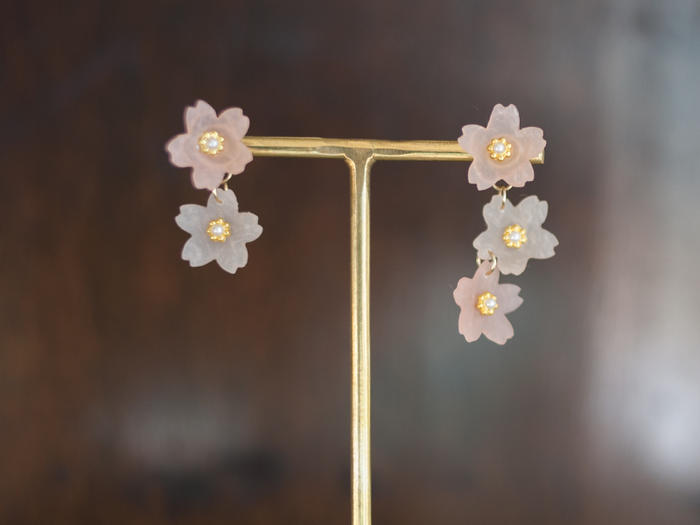 - すりガラスのような質感のポリマークレイで製作した桜のピアスまたはイヤリングです。