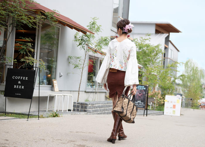 制服の時代にも、バッグは古着屋で見つけてきてはリメイクをしてきましたし、人生大一番のウエディングドレスはもちろん自分で作り、子供服はわたしの服をリメイクして作りました。 -