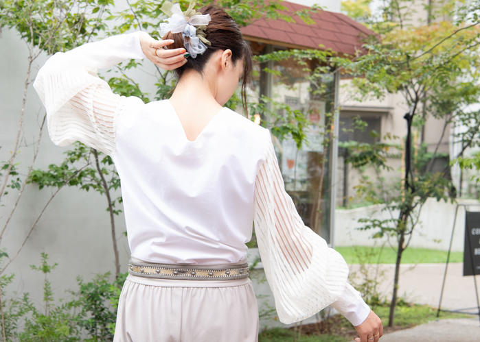 一着でたくさん楽しめるブラウスです。背中はまとめ髪が映えるVでも丸でもない絶妙な形です。 -