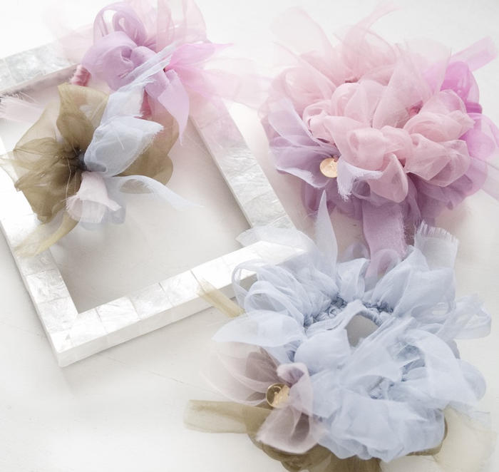 もう着ないし、とウエディングドレスでベビー小物を作ろうと裂いてみたのです。このときに生まれた自由な風合いの不思議なリボンの虜となり、ありとあらゆる生地を裂き暮らしました。