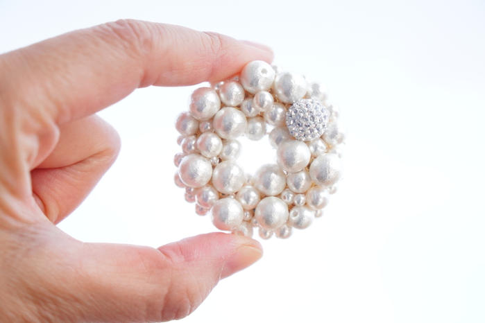 - 人気の「クリスタルホワイト」のスワロフスキーパヴェボール10mmと、ホワイトのコットンパール、その他の部分はスワロフスキーパールのみで制作しています。