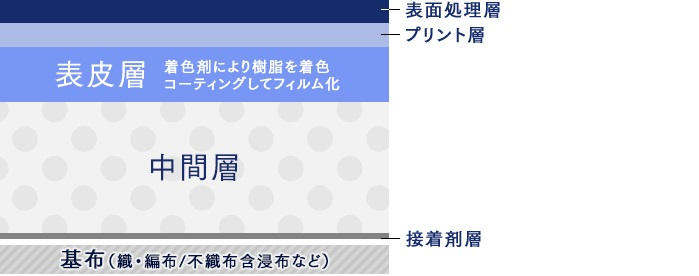その構造のおかげで大量に作ることができ、安価に生産ができる。ただ、デメリットとしては、基布が生地で、接着しただけなので、強度の問題や劣化による表面の剝がれが起きてしまいます。 -