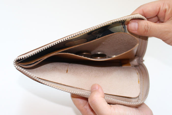 また、本体のファスナーをきちっと閉めると小銭がこぼれ出る心配もありません。 -
