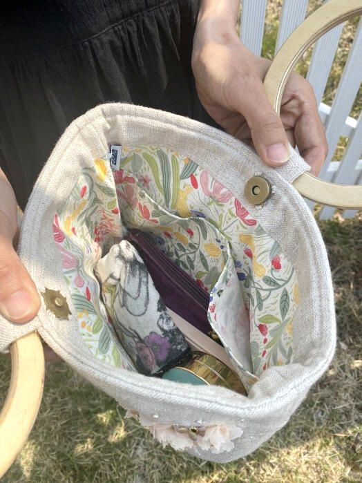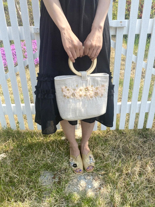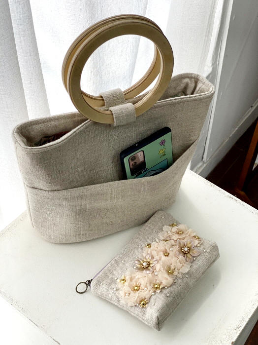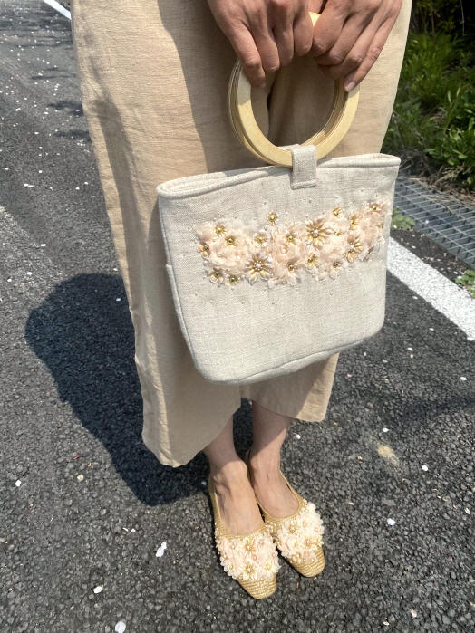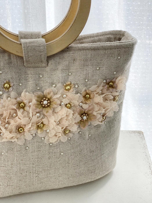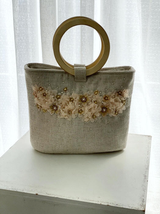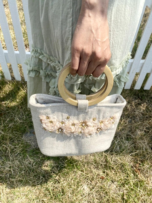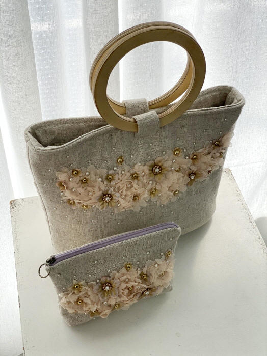 - -アジサイ ウッドハンドルバッグ+ 化粧ポーチ ( 2点)