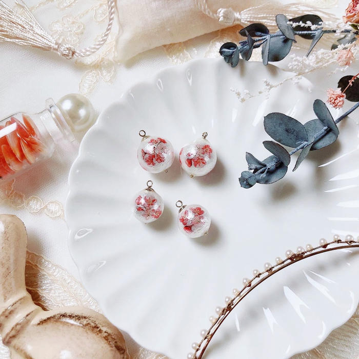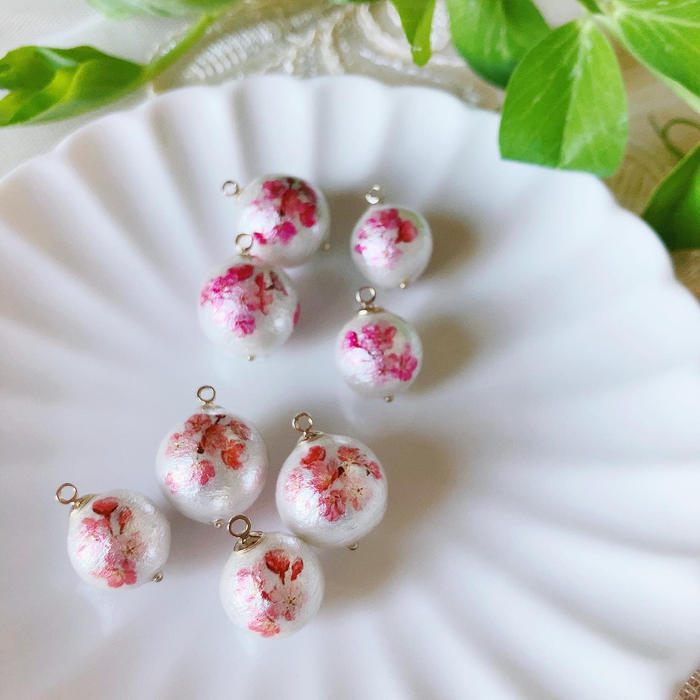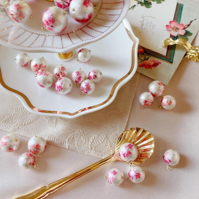 - ひらひら舞い踊る桜の花びらのように、軽やかでふんわりとした印象のコットンパールチャーム。大小2サイズそれぞれお楽しみいただける4個セットです。