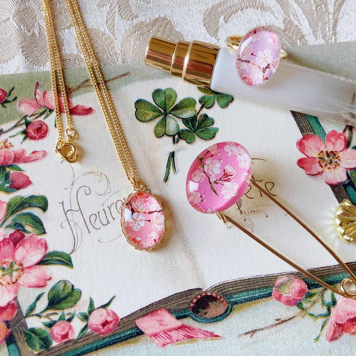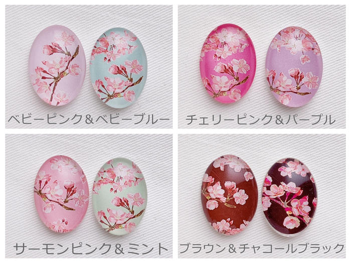 - 透明感たっぷりなガラスを使ったカボション。プリントした桜の絵柄をガラス背面に貼り付け、全面をレジンで包むように丁寧にコーテイングしました。
