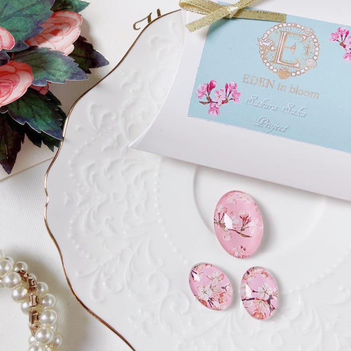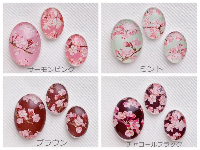 - 透明感たっぷりなガラスを使ったカボションです。プリントした桜の絵柄をガラス背面に貼り付け、全面をレジンで包むように丁寧にコーテイングしました。