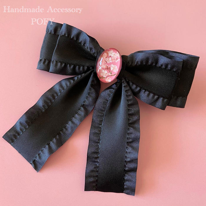 - 存在感ばつぐんのガラスカボションは、貼り付けるだけでも簡単に主役級アクセサリーの完成♪こちらはチェリーピンクのガラスカボション(大)に、黒リボンを合わせたガーリーなヘアクリップ♡(作品提供:POFYさま)