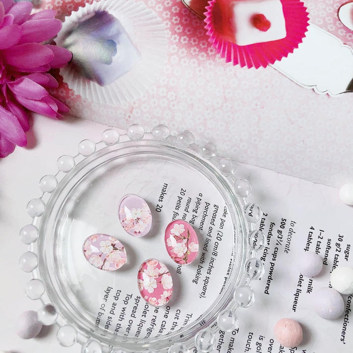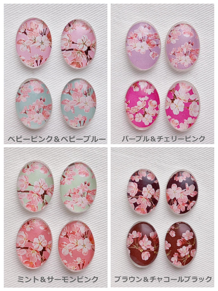 - 透明感たっぷりなガラスを使ったカボション。プリントした桜の絵柄をガラス背面に貼り付け、全面をレジンで包むように丁寧にコーテイングしました。