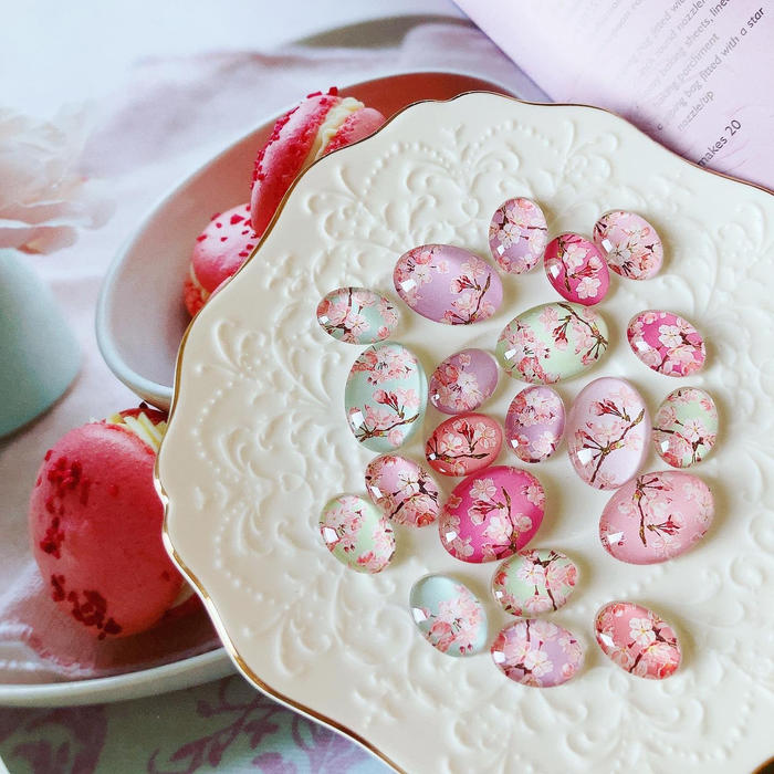 - 透明感たっぷりなガラスを使ったカボション。プリントした桜の絵柄をガラス背面に貼り付け、全面をレジンで包むように丁寧にコーテイングしました。