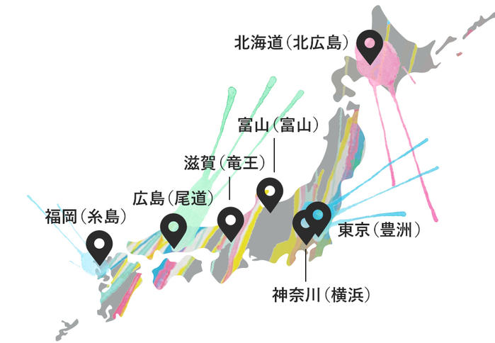 この度、思いに賛同くださった、企業・団体※とともに「ENLIGHT2021実行委員会」を結成し、全国7か所でパブリックアートを同時展開するプロジェクト『ENLIGHT2021』を立ち上げました。 - 本プロジェクトでは、表現の場として北海道(北広島)、東京(豊洲)、神奈川(横浜)、富山(富山)、滋賀(竜王)、広島(尾道)、福岡(糸島)、全国7か所の古民家や遊覧船、ガスタンク、地下街、商業施設などを各地の皆様のご協力のもとで用意しました。