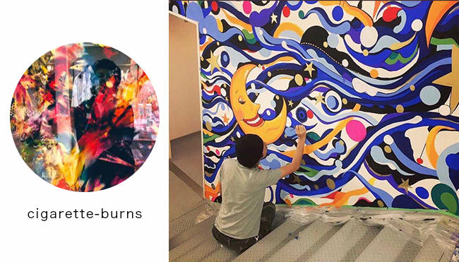 - cigarette-burns(シガレットバーンズ)とは、画家、デザイナー、イラストレーター、ペインターとして、福岡を拠点に活動するMaruによるアーティスト活動。ガラス用塗料を使用し、透明なアクリル板に絵を描く独特の手法が特徴。光の透過を利用し、見る角度により表情が変化するアート作品を制作。ライブペイント(即興で絵を描く表現手法)を用い、絵を描いている姿もパフォーマンスとして楽しんでもらうのが主なスタイルとなっている。