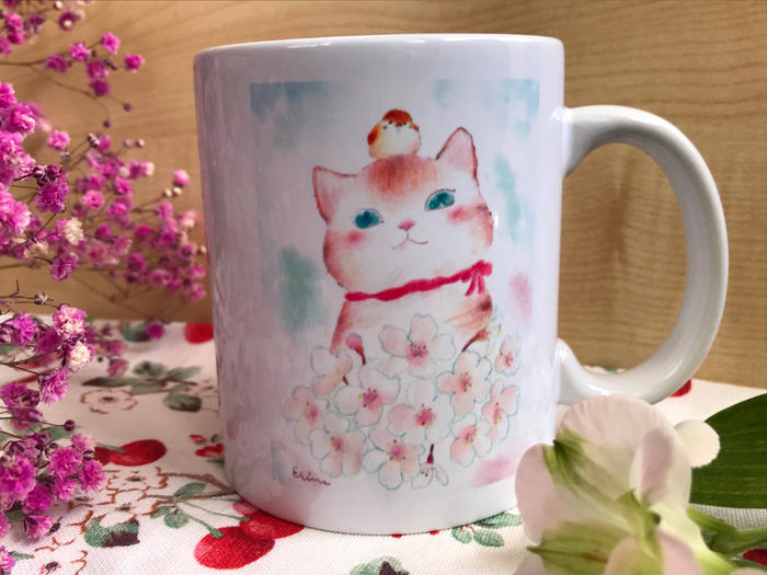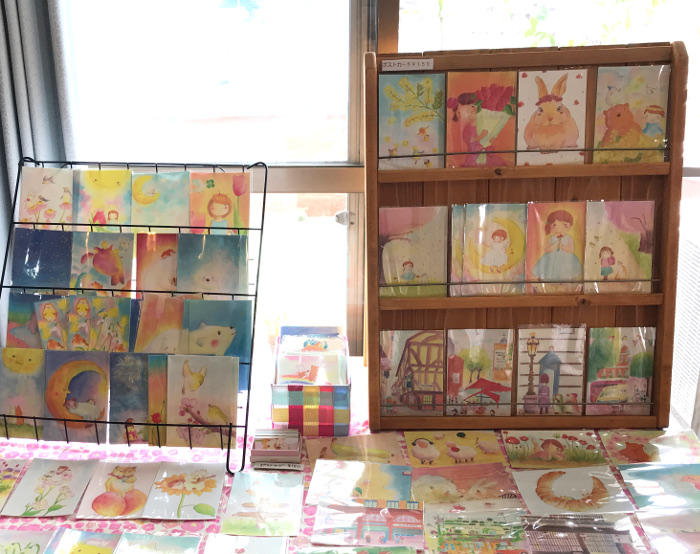 新作の「花言葉とものがたり」の絵柄のポストカードや、マグカップもご用意しました。 -