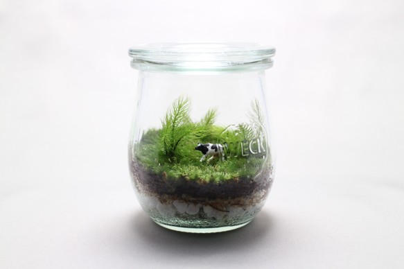 - 2つ目は、苔テラリウム 牧場 牛のいる風景 WECKです。本物の生きた苔を使ったテラリウムです。
