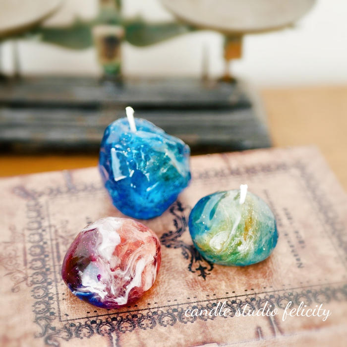 ワックスの融点や色調、透明度、仕上がりの質感の違いによって様々なキャンドルが出来上がります。