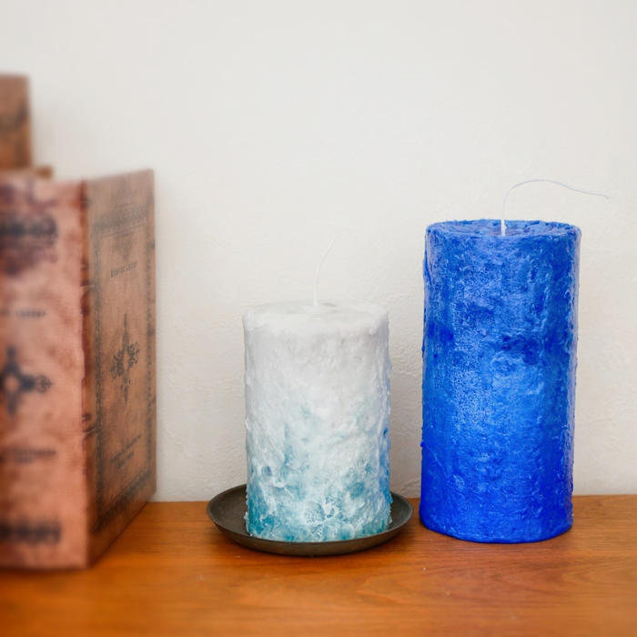 キャンドルはヤシを原料にしたパームワックスを使用し、アクアブルーのさわやかな色合いに仕上げました。