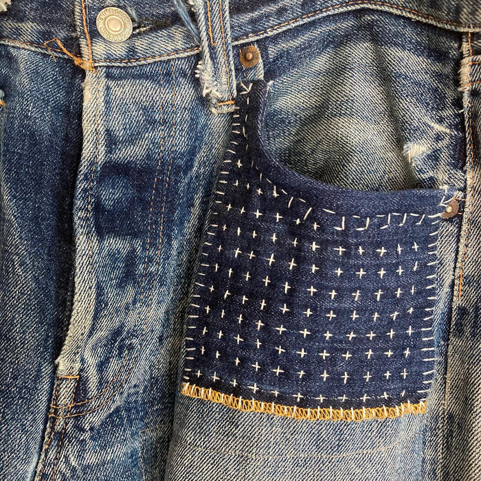 - もう少し具体的に言うと、デニムの自然な色落ちによって現れるインディゴブルーのグラデーションに加え、もっと“劣化"が進み擦り切れた部分に施される「刺し子」などのリペアです。これらはデニムの大きな魅力と言えます。