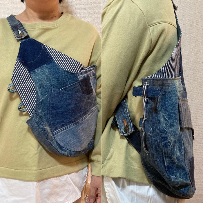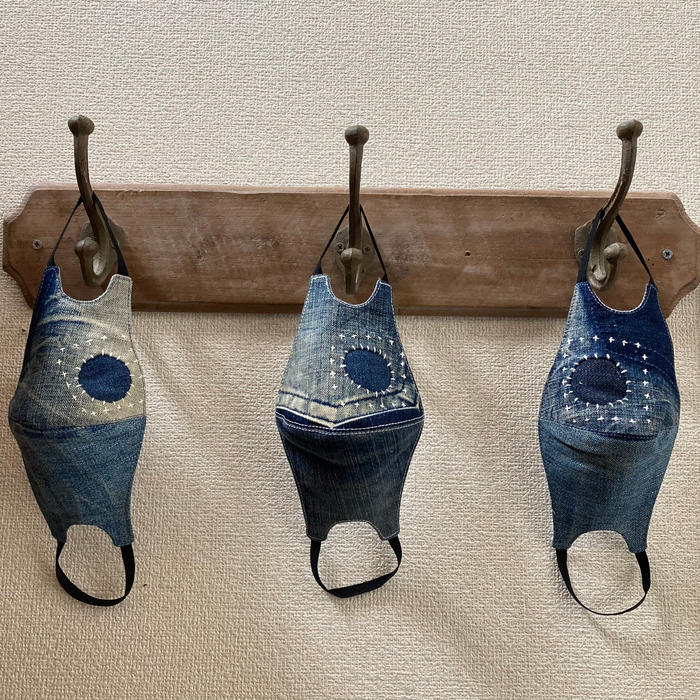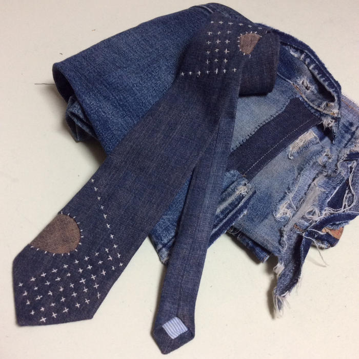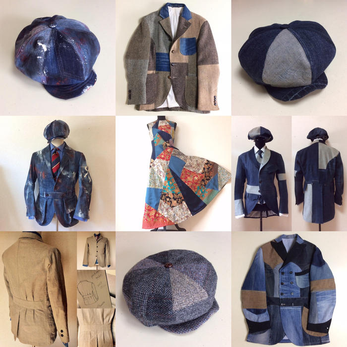 - 古着のデニムがパッチワークデニムのキャスケット、ネクタイ、ベスト、スカート、ジャケットなどに生まれ変わります。