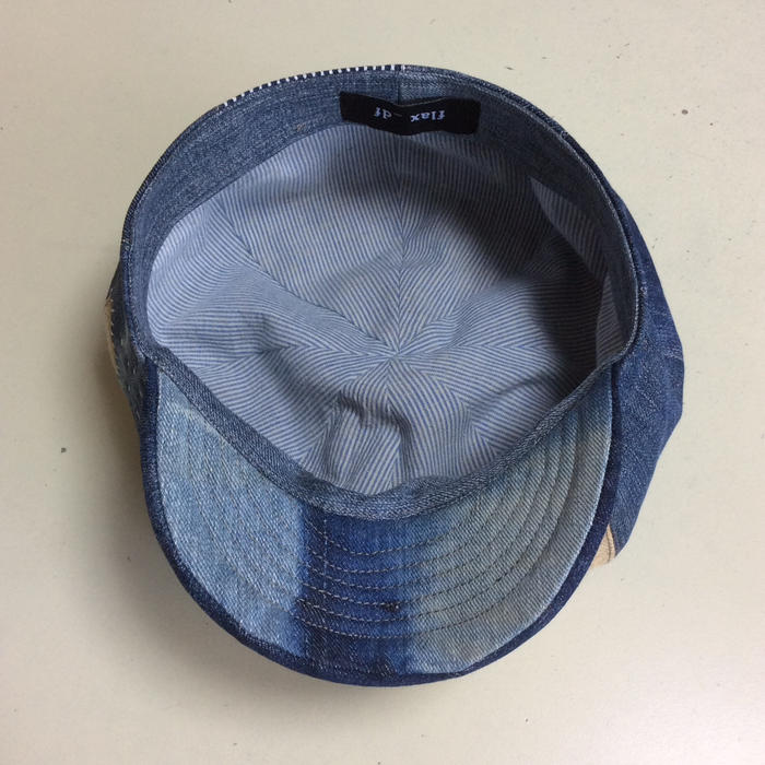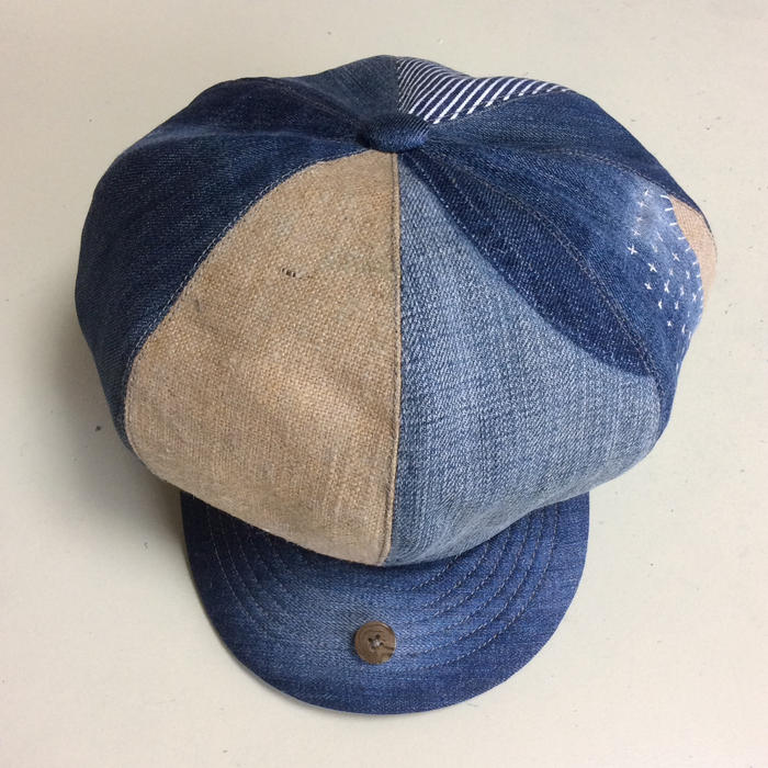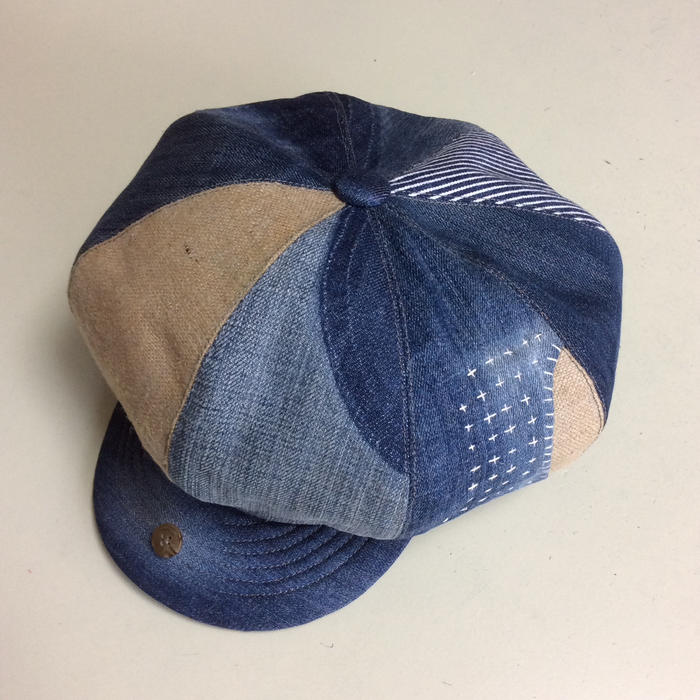 刺し子を施したダメージデニムとチェコ軍の麻袋、及びヒッコリー生地を使い独特の雰囲気を創り出したキャスケットです。トップをボタンで開け閉めでき、2種類の着用が楽しめます。