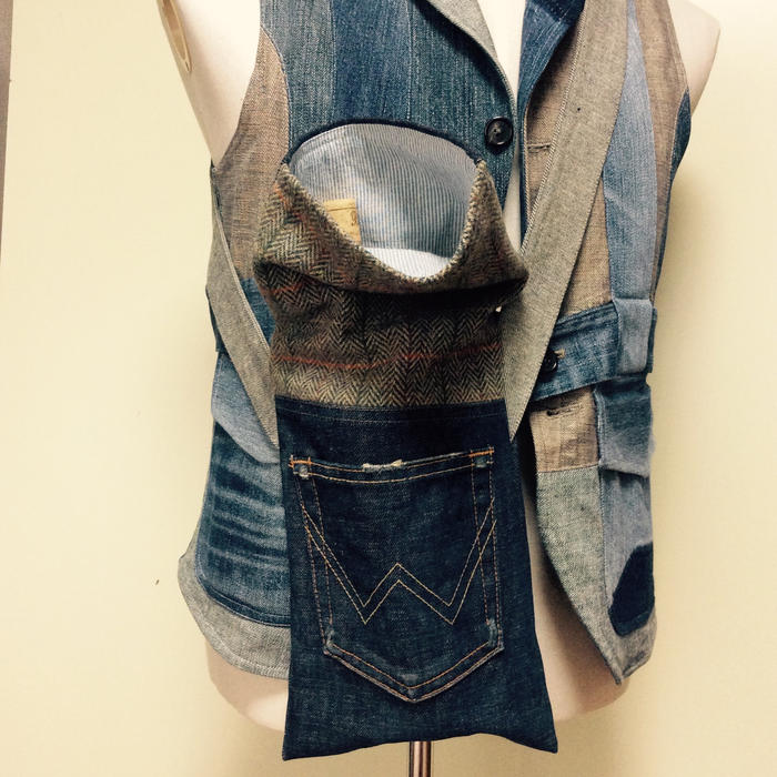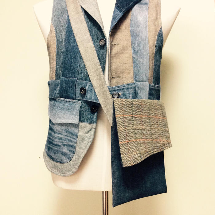 ユーズドのツイードとデニムを使って製作したこちらのサイズは27cm×18cmというコンパクトなものでショルダーベルトは103cm。裏地はコットンリネンのストライプ地。