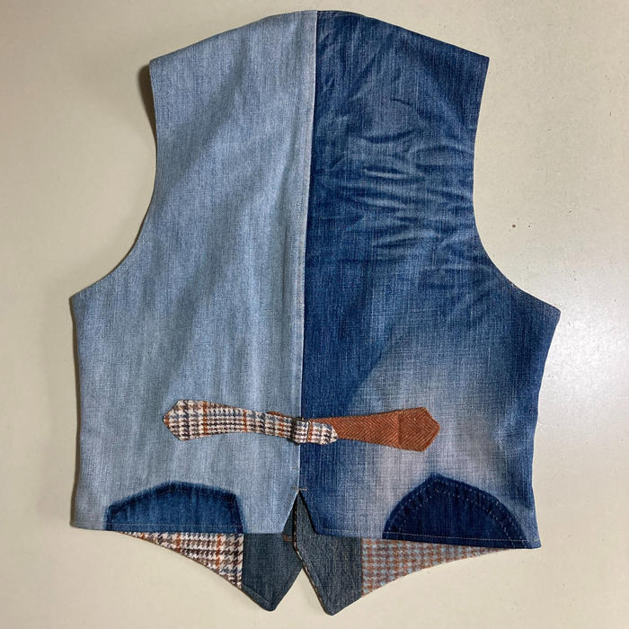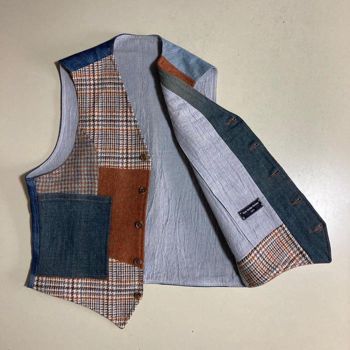3着のツイードジャケットとユーズドデニムを丁寧にほどきパッチワークベストに仕立てたリメイク作品です。