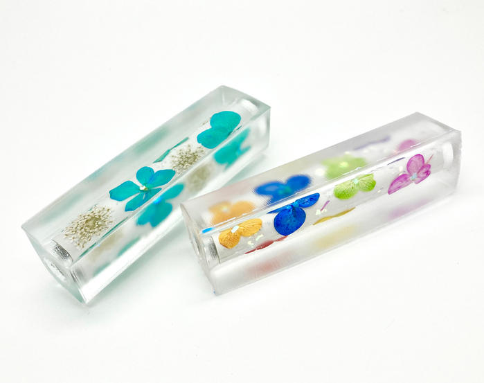 飛騨の土地で作られた生花を押花シートとして、カラーリング(着色)を行い美しさを保つ工夫をします。そしてUVレジン乾燥をして出来たものを型枠にセットし、そこに樹脂を流し込んで角材へと成形します。乾燥成形後に出来上がった角材を、旋盤にて一つづつ丁寧に削り出し、職人の手作業により磨き上げ、製品仕上げをし完成させます。 -