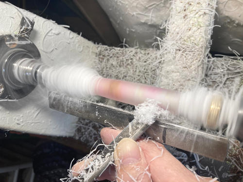 - 樹脂で固めた角材を、旋盤を使い削り出していきます。