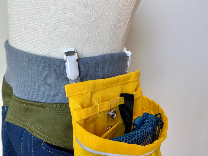 - クリップをズボンなどのボトムのウェストにパチンと留めて、ウェストポーチのように使います