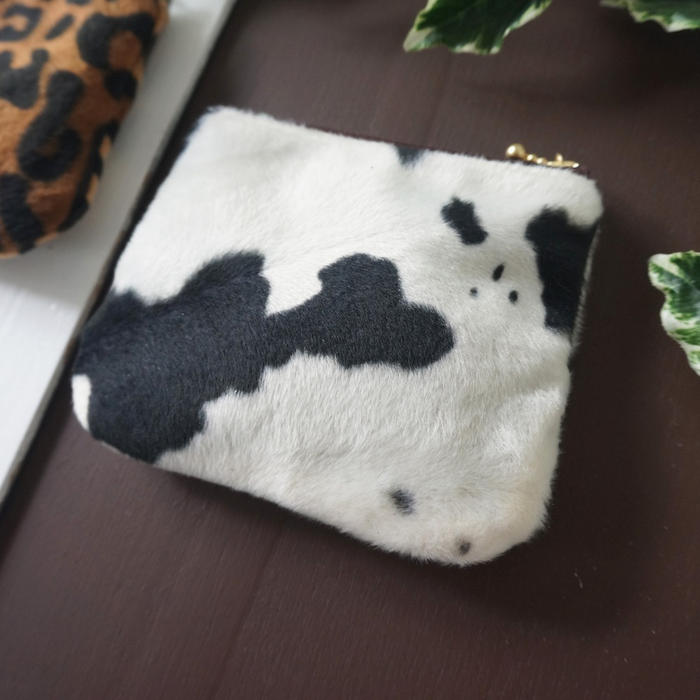 アニマル柄のふわふわエコファーでまんまるポーチを作りました。