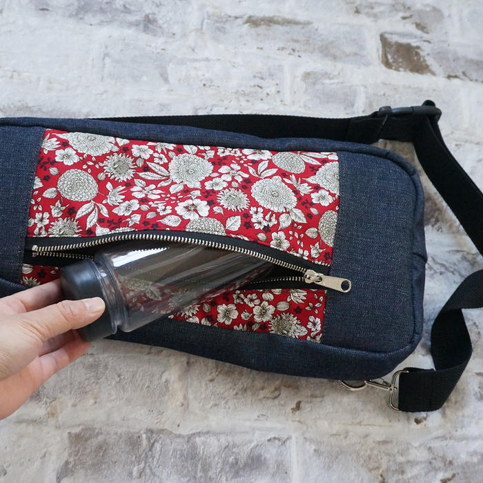 - 岡山デニムと繊細な花柄のコットン生地を使用した大人向けボディバッグ。