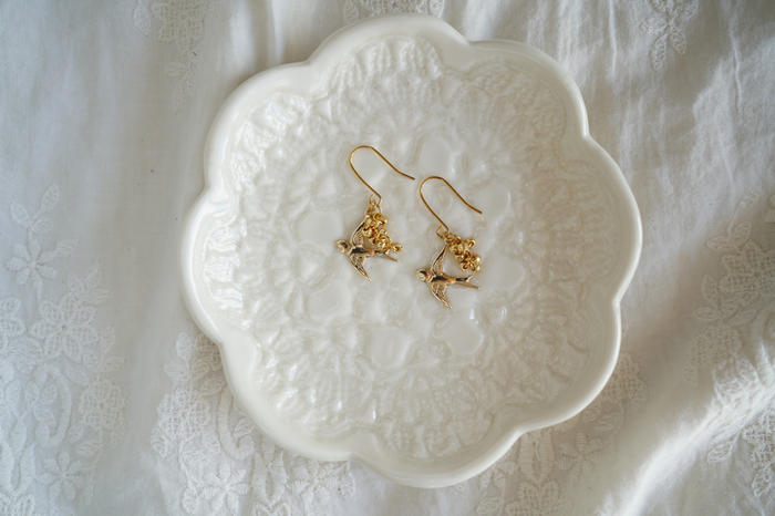 - ロングネックレスとおそろいのツバメが飛んでいます。