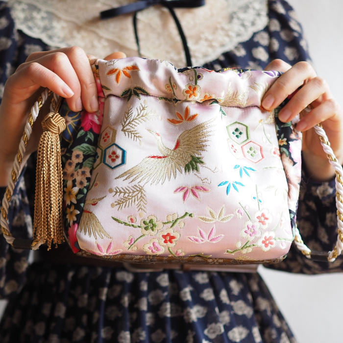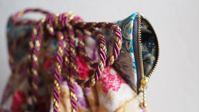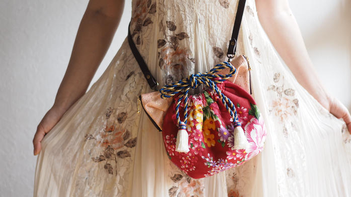 2wayで使える台湾花柄x絹織物の巾着バッグ