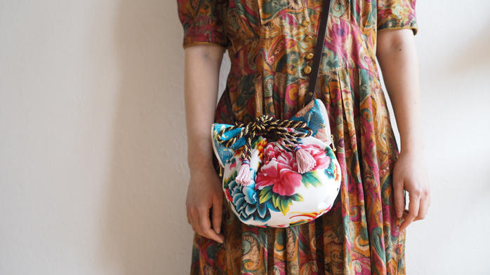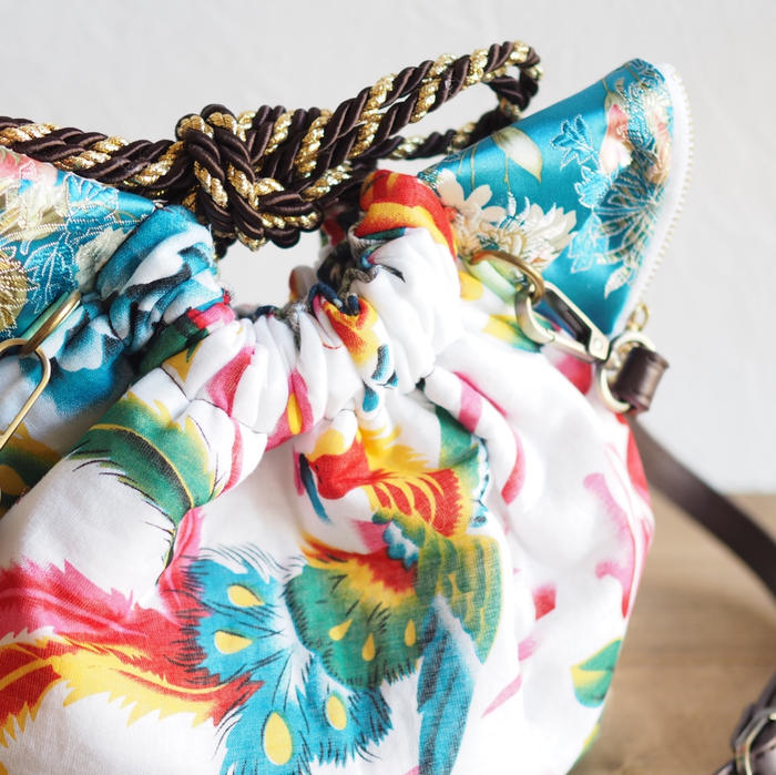 この作品は台湾花柄をメインに使い、サブ生地(耳)の絹織物と合わせて作られています。今回指定できるのは台湾花柄生地のみ。サブの絹織物(耳)と裏生地の合わせは「Good Taiwan」にお任せください。