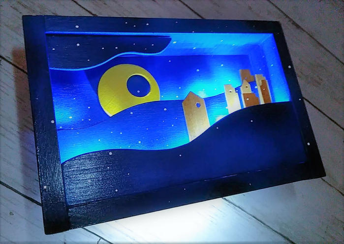素材は全て木材を使用。作品の星空感が広がるよう、フレームにも星空ペイントを施しました。