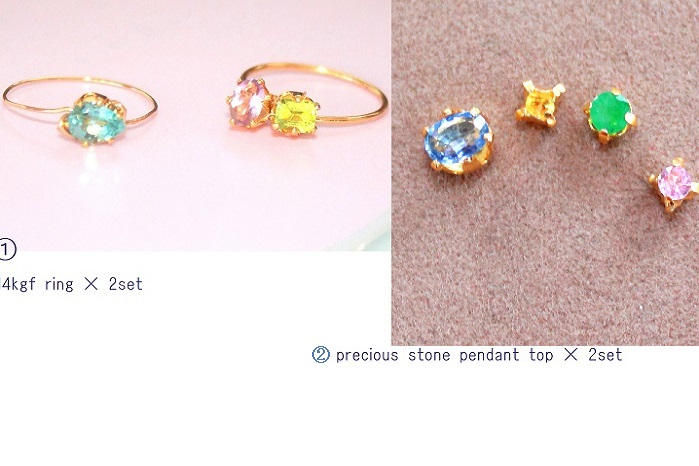 ()の中の石から2つ選んでいただいた石を、14kgfリングにセットしたものをお送りします。