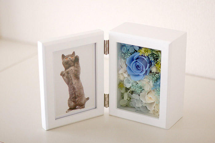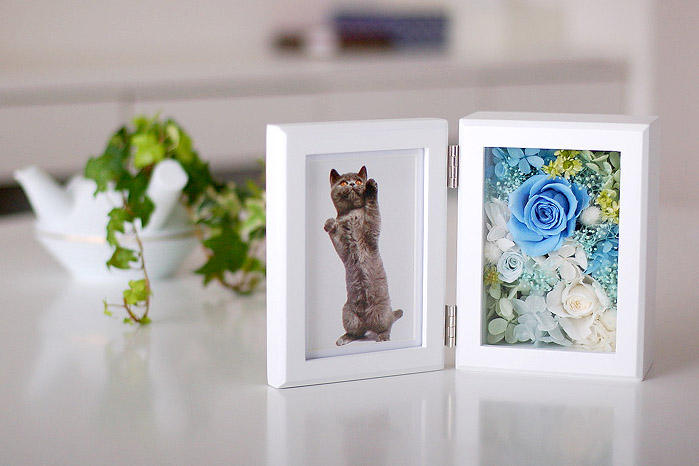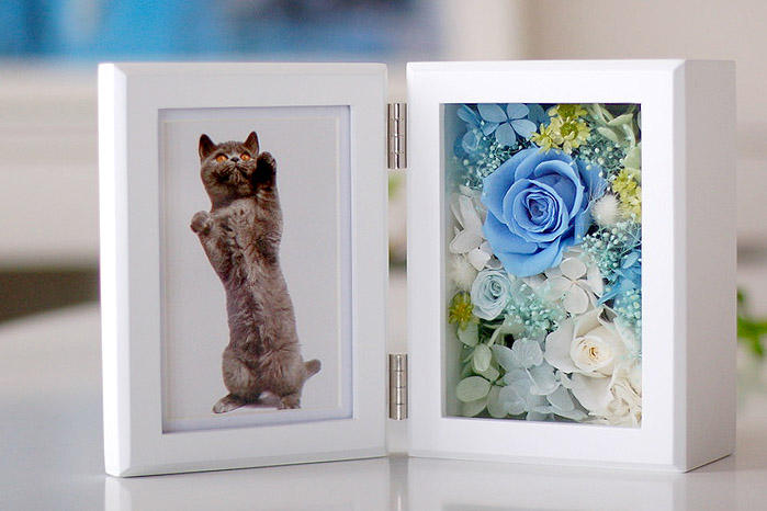 - 木製の二つ折りフォトフレームに寒色系のお花をあしらったフォトフレームアレンジです。