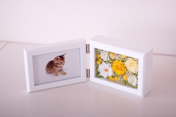 - 木製の二つ折りフォトフレームに暖色系のお花をあしらったフォトフレームアレンジです。