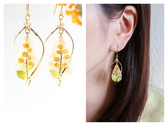 - 桜、ミモザ、かすみ草(自然の花)を使用したアクセサリー。