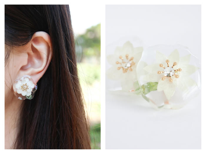 まるで水中に咲くお花のような透明感あるアクセサリーをお楽しみください。