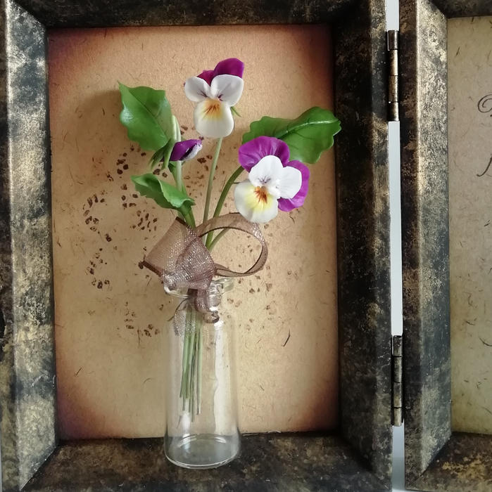 花‥樹脂粘土、油絵具、ワイヤー、リボン、ガラスの小瓶 -