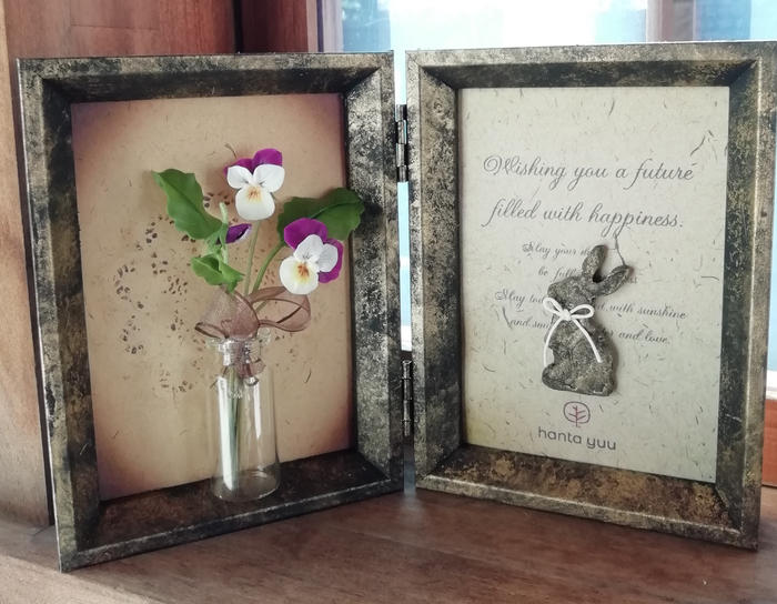 右の額には樹脂粘土で作ったうさぎが座って居ます。お花を見ているの?明日を見ているの?