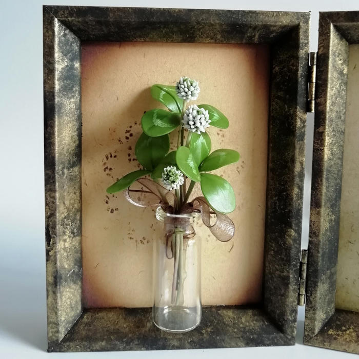 花‥樹脂粘土、油絵具、ワイヤー、リボン、ガラスボトル