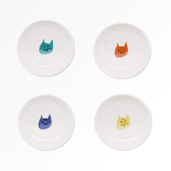 - ぷくっとかわいい4色のねこをあしらった4つの小皿。